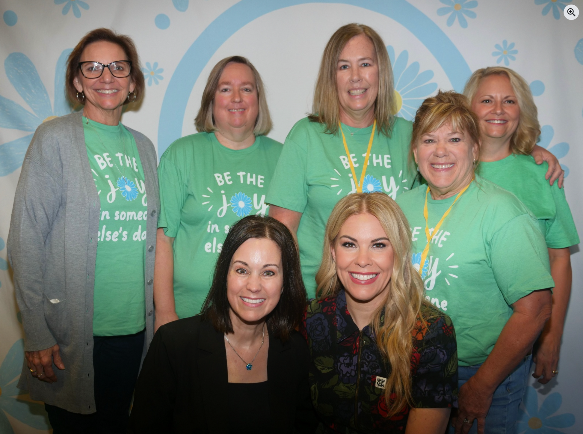 Front print: “Be the Joy in Someone Else’s Day” with blue Joytime flower