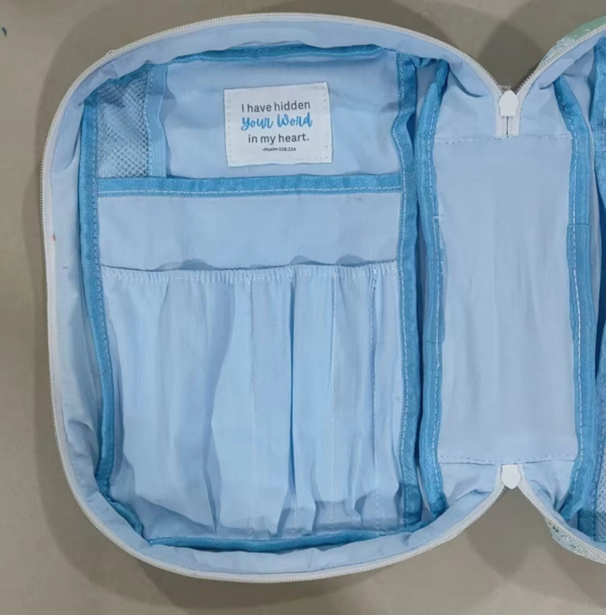 Bonus mesh pocket with small Bible Clips - blue flower and heart!